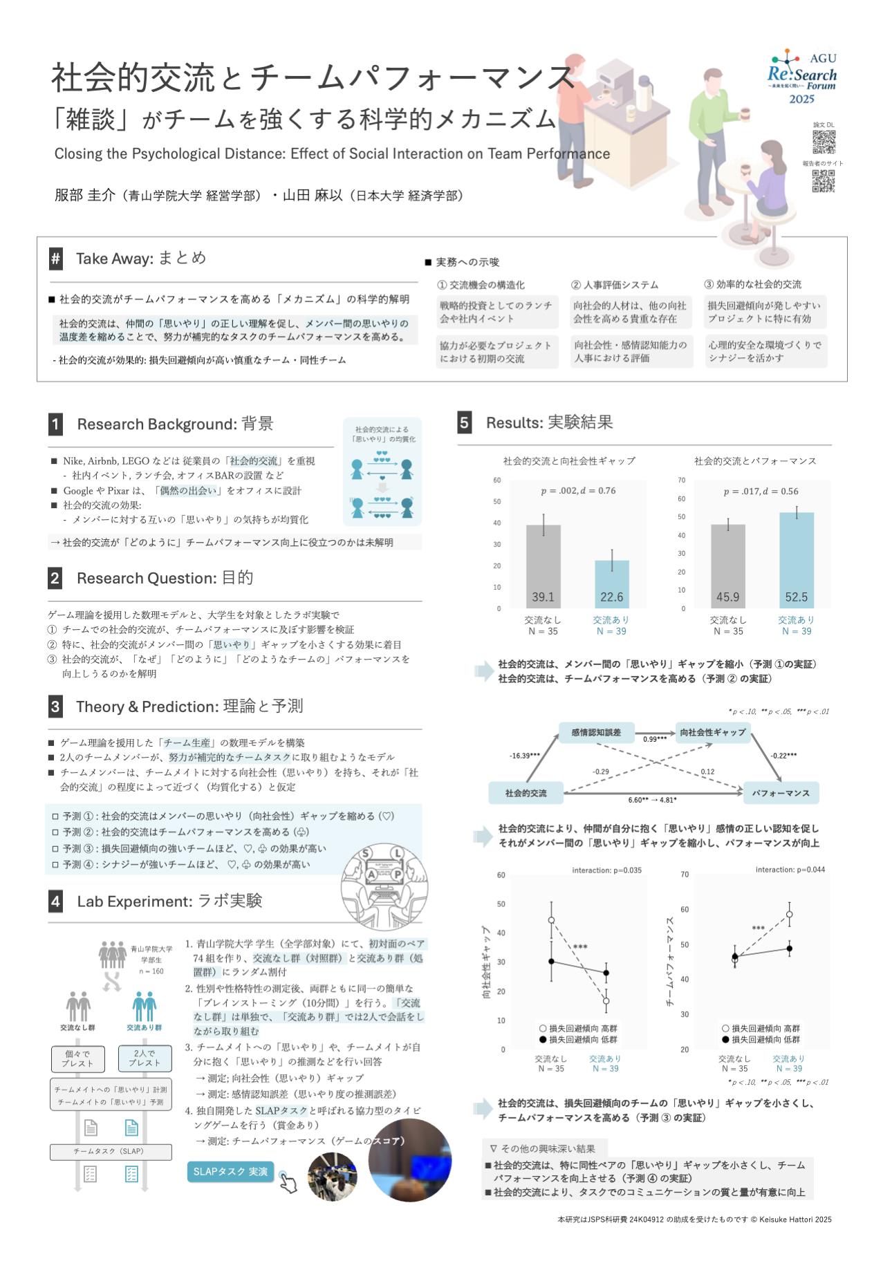 青山学院大学リエゾンセンターが主催するAGU Re:Search Forum 2025にて、日本大学の山田麻以先生との共同研究である Closing the Psychological Distance: Effect of Social Interaction on Team Performance のポスター報告をさせていただきました。