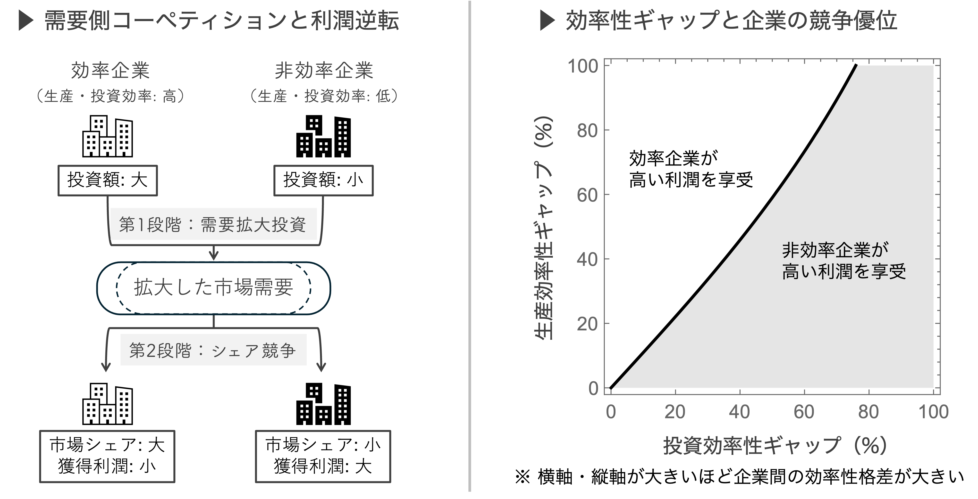投資能力の高い事業者が業界需要拡大を主導し、その便益が競合を含む全参加者に及ぶという点です。言い換えれば、誰かが投資すればその恩恵は業界全体に広がりますが、コストは投資した企業だけが負担します。このような環境において、企業間の効率性格差は競争優位や利潤分配にどのような影響を及ぼすのでしょうか。